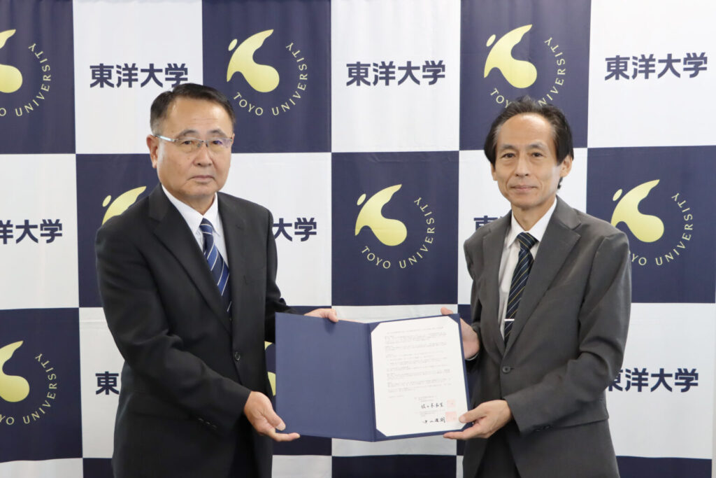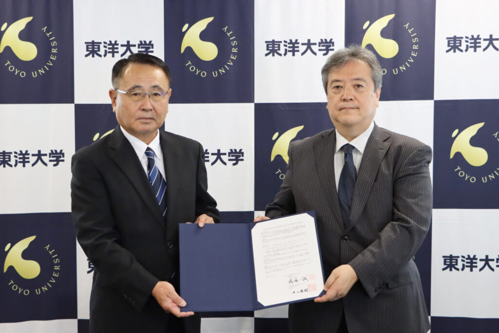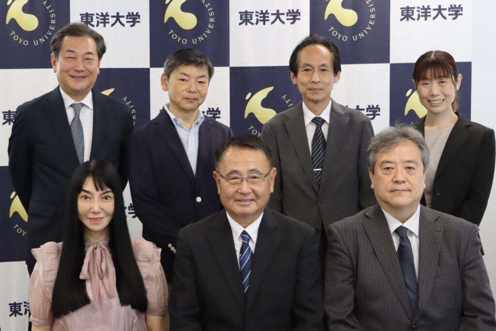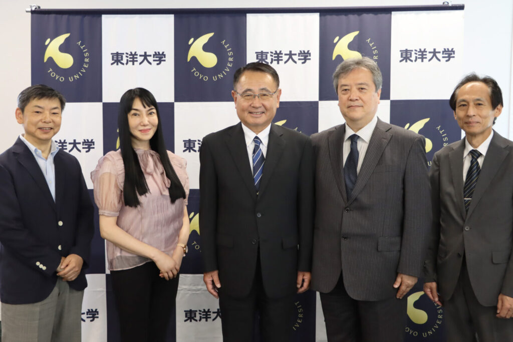 The signing was made by Akihiro Matsumoto, Director of Engineering, Chieko Kato, Dean of the Department of General Information, Kazunari Narumi, Director of Life Science, and Tatsuro Nakayama, Principal at the Asaka Campus of Toyo University.